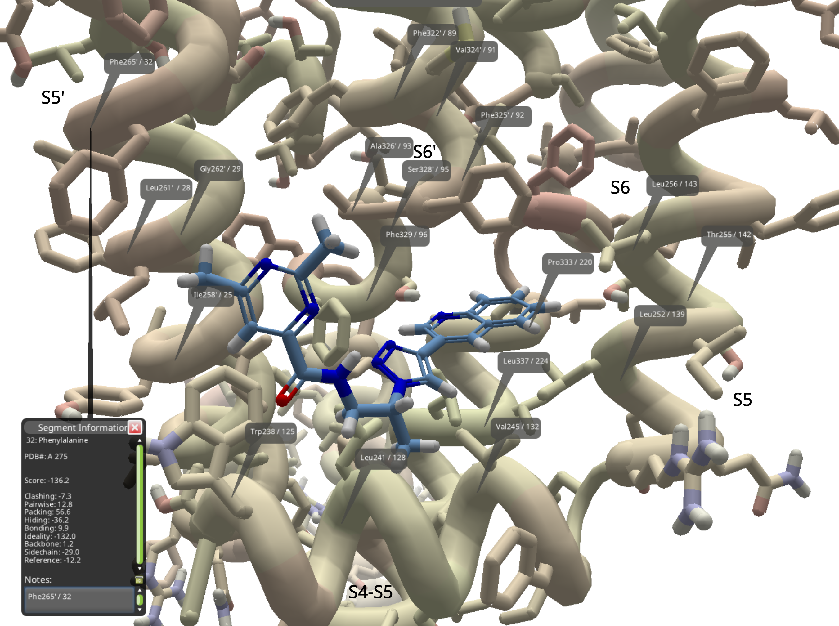 The numbers posted are 10 residues lower than the PDB model. The "prime" entries like Phe265' mean PDB chain A. Without the prime, like Leu256, it's chain G. So Phe265' refers to PDB chain A, residue 275, as indicated in the segment information window below.