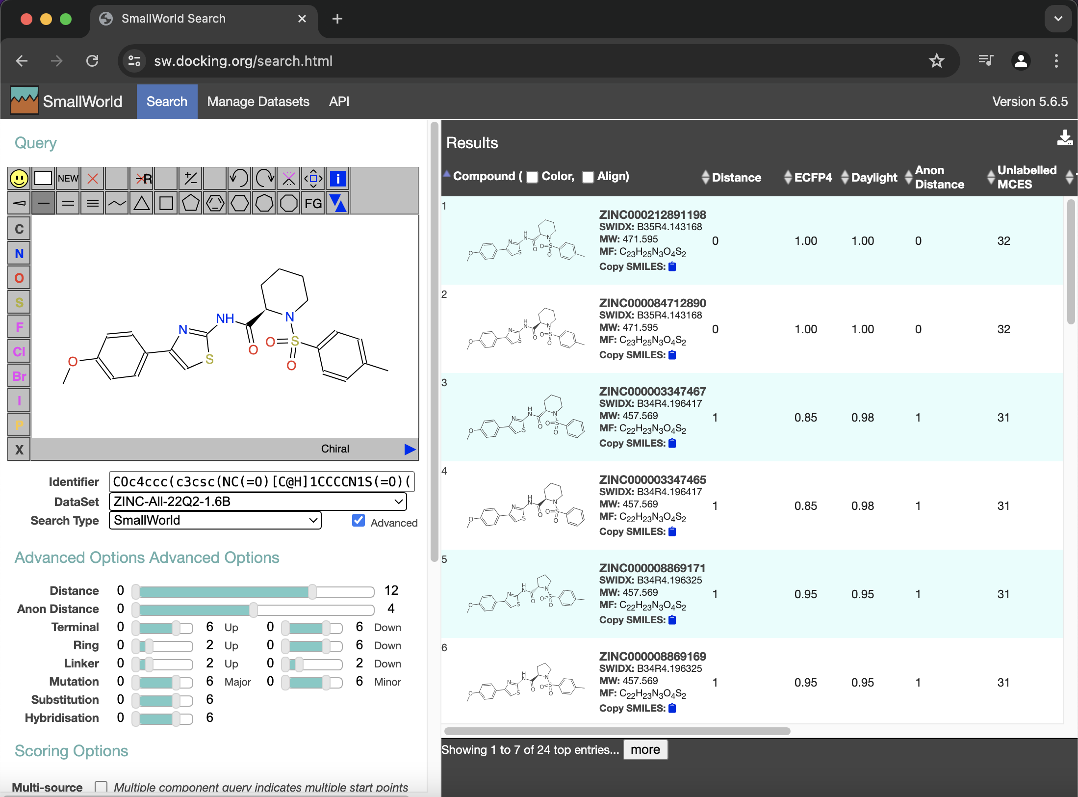 I think hits 1 and 2 are the R and S forms of ML277 (but which is which?). Hits 3 and 4 look like they've removed a methyl (-CH3) from the tolyl group of ML277. I think hits 5 and 6 just changed the twisted 6-membered ring of ML277 to a twisted 5-membered ring. Ideally one should be able to find these top 6 hits on the ZINC site as well, but even a simple search there wasn't working for me earlier today. The Unlabelled MCES column above looks like the # of heavy atoms in each ligand.