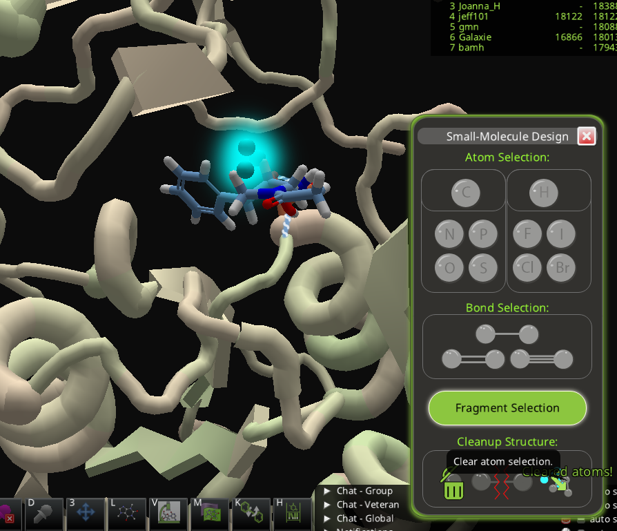The atom I had selected in the trial puzzle for compound bonus=ses in devprev persisted in empty space when switching to the other small molucule puzzle. While loading, the splash screen 'loading' was overwritten partially by the small molecule selection popup window. It cannot be removed with the 'clear atom selection' icon.