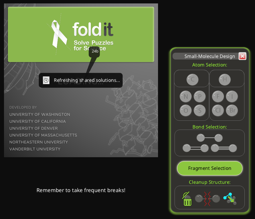 If the "Small-Molecule Design" panel is open, it shows up during "Refreshing shared solutions" while the next puzzle is loading. Any segment notes also peek through at this point.