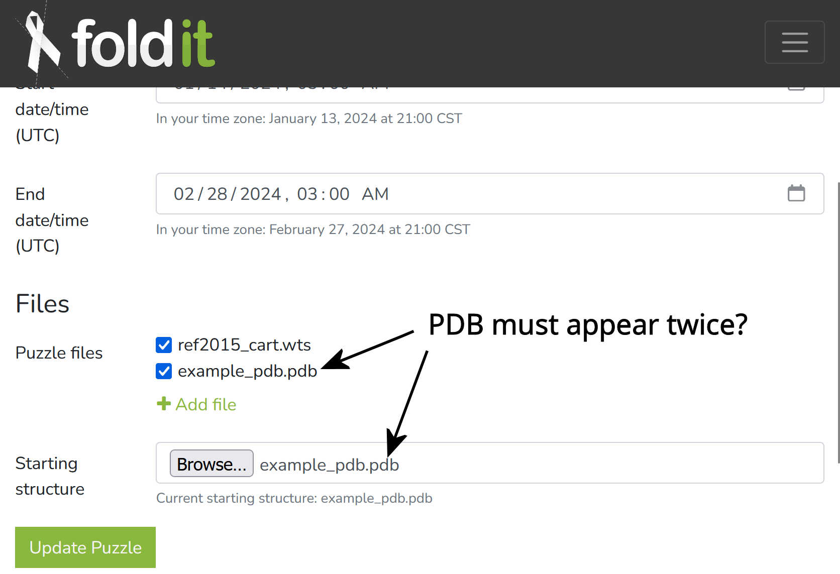 When the PDB only appears in the "starting structure" field, theprivate puzzle fails to open. A popup appears: