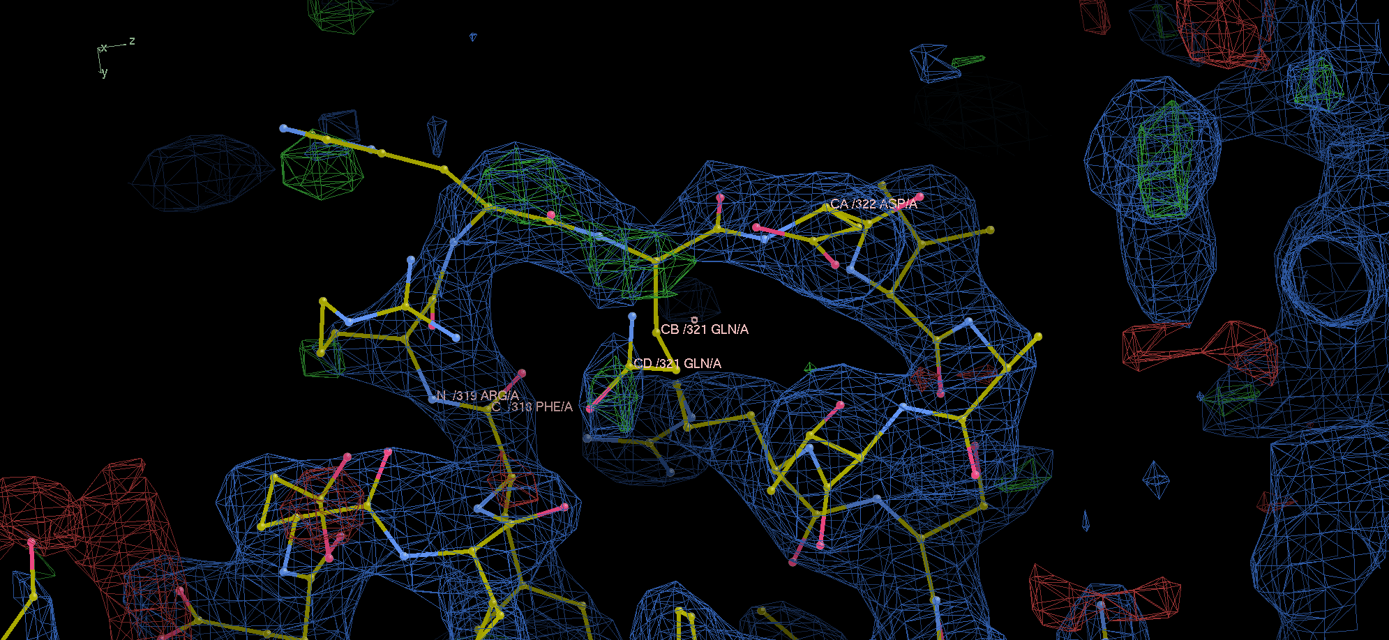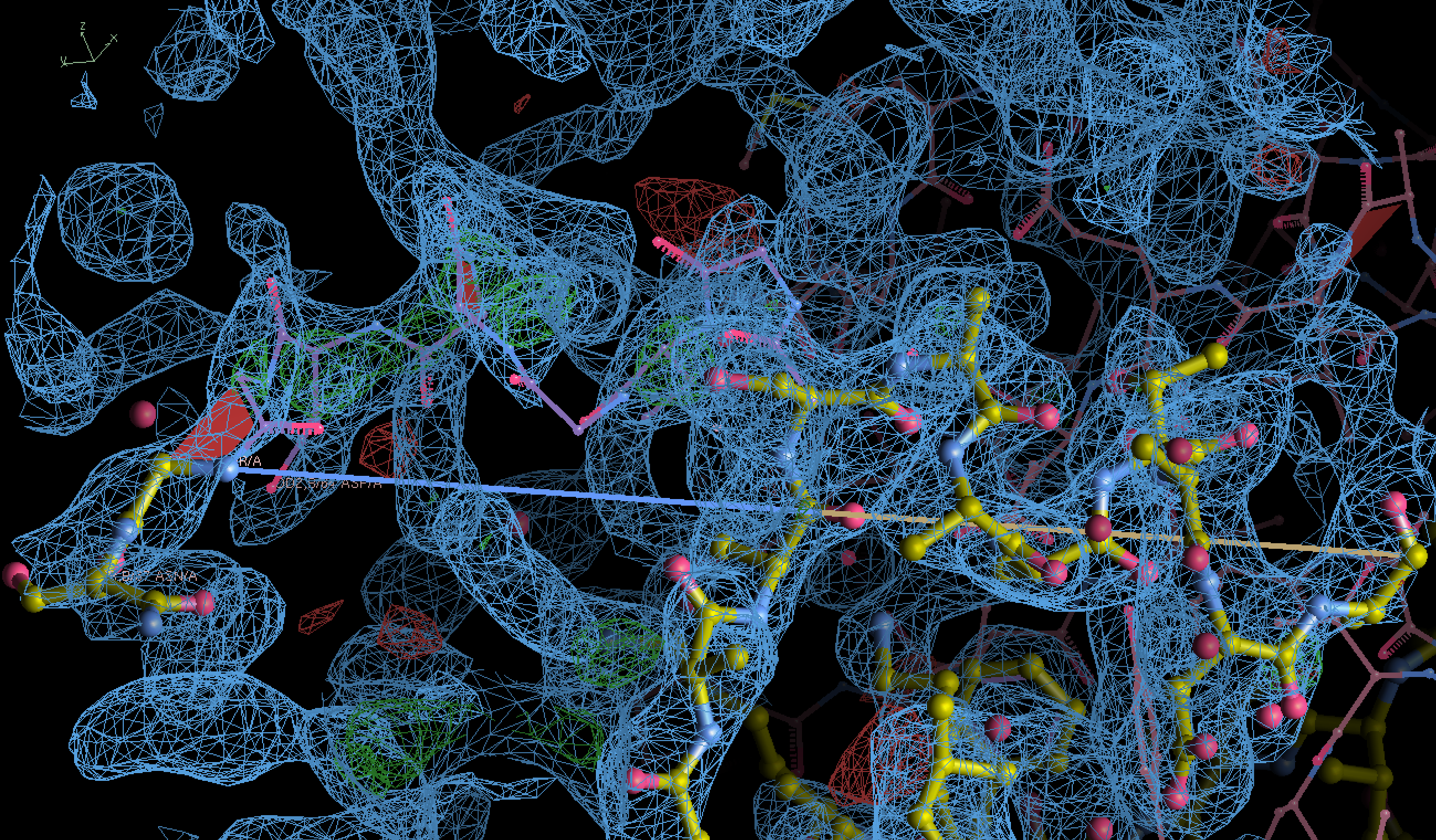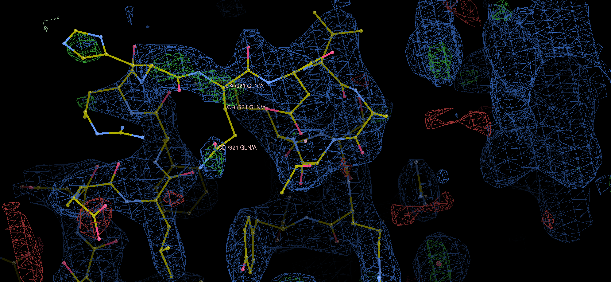 In the figure, 2Fo-Fc map is colored in blue and contoured at 1 r.m.s.d., and the Fo-Fc map colored in green/red for positive/negative densities contoured at +/- 3 r.m.s.d..