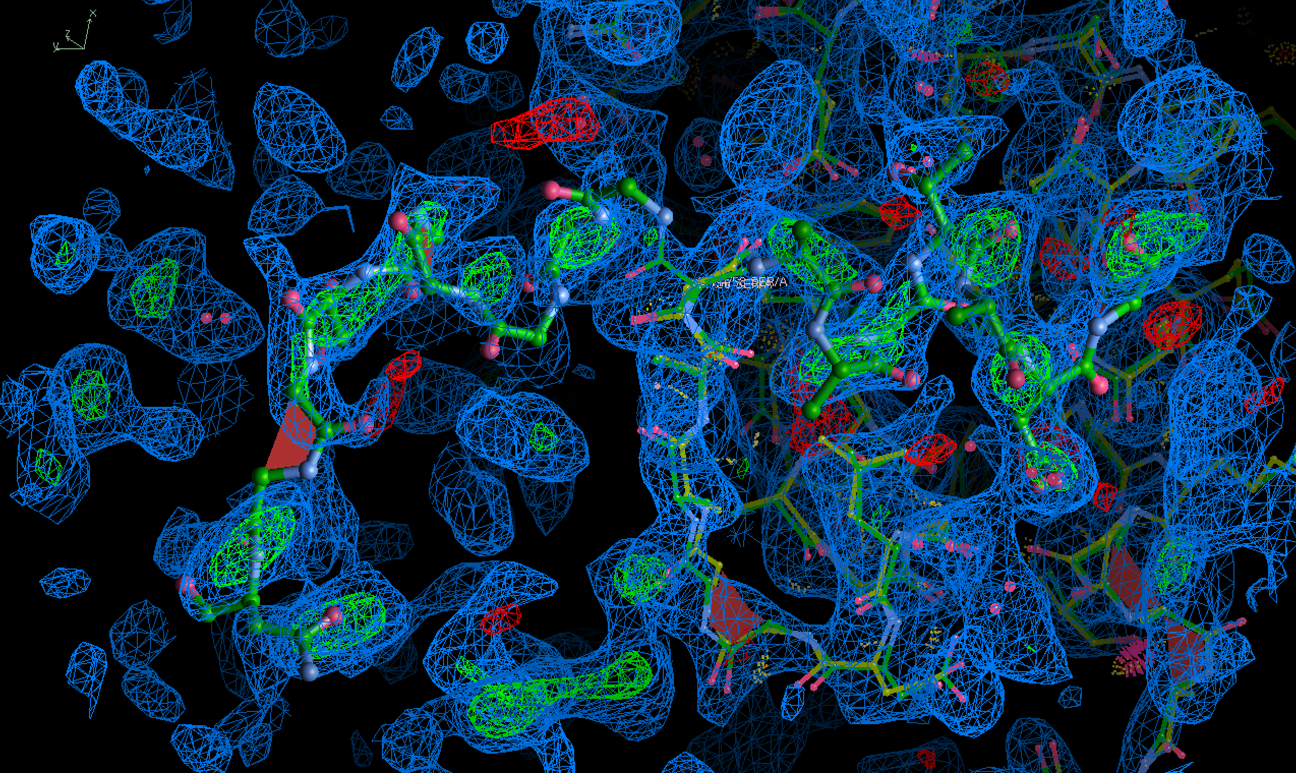 Using the same contour level, but the deleted resides from alignment are shown as green ball-and-sticks for clarity, and the model displayed as wires.