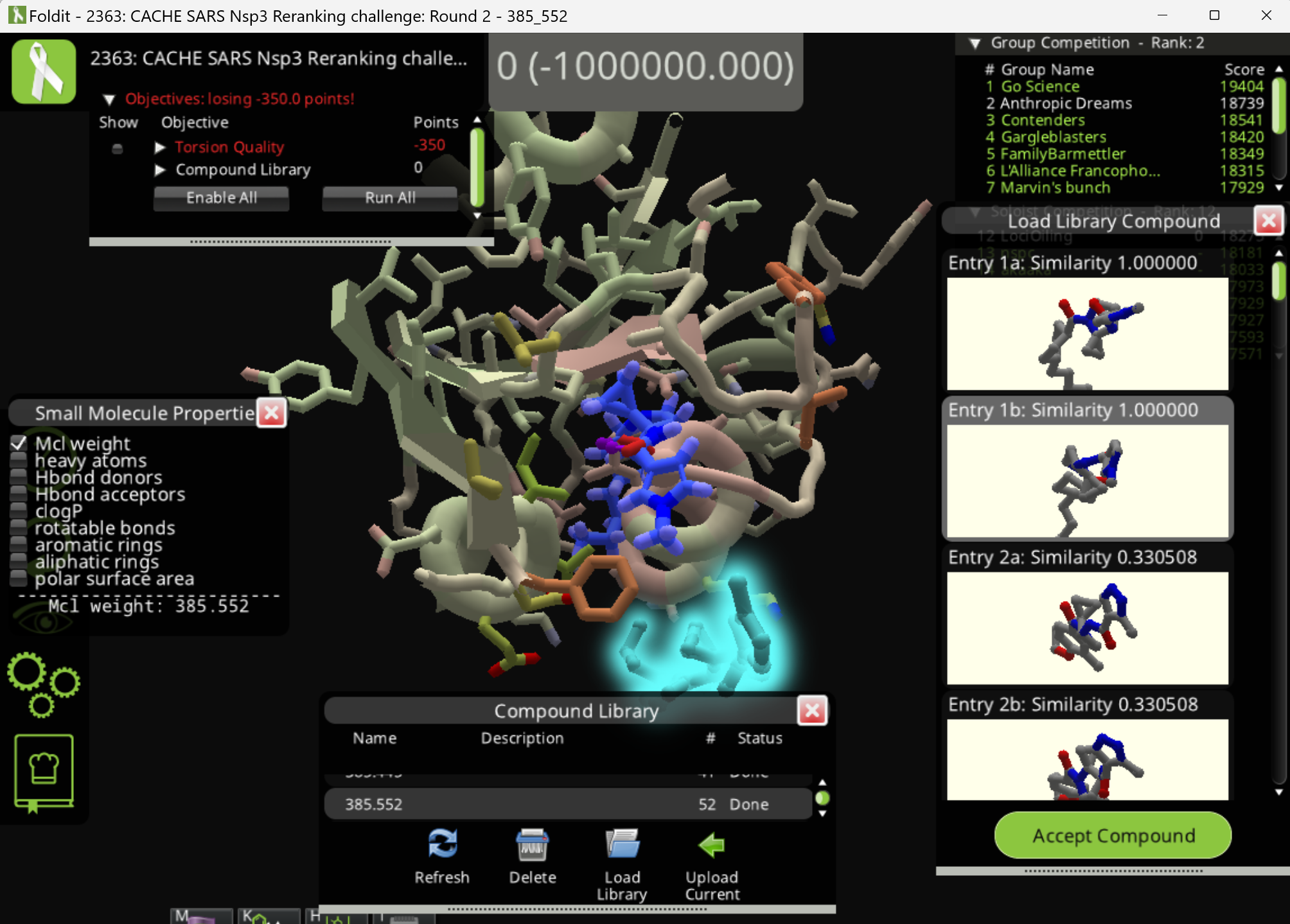 For 385.445 and 385.552, having the compound library window open doesn't earn the bonus. Accepting the a or b version also doesn't earn the bonus. Shaking and wiggling doesn't help in any of these cases.