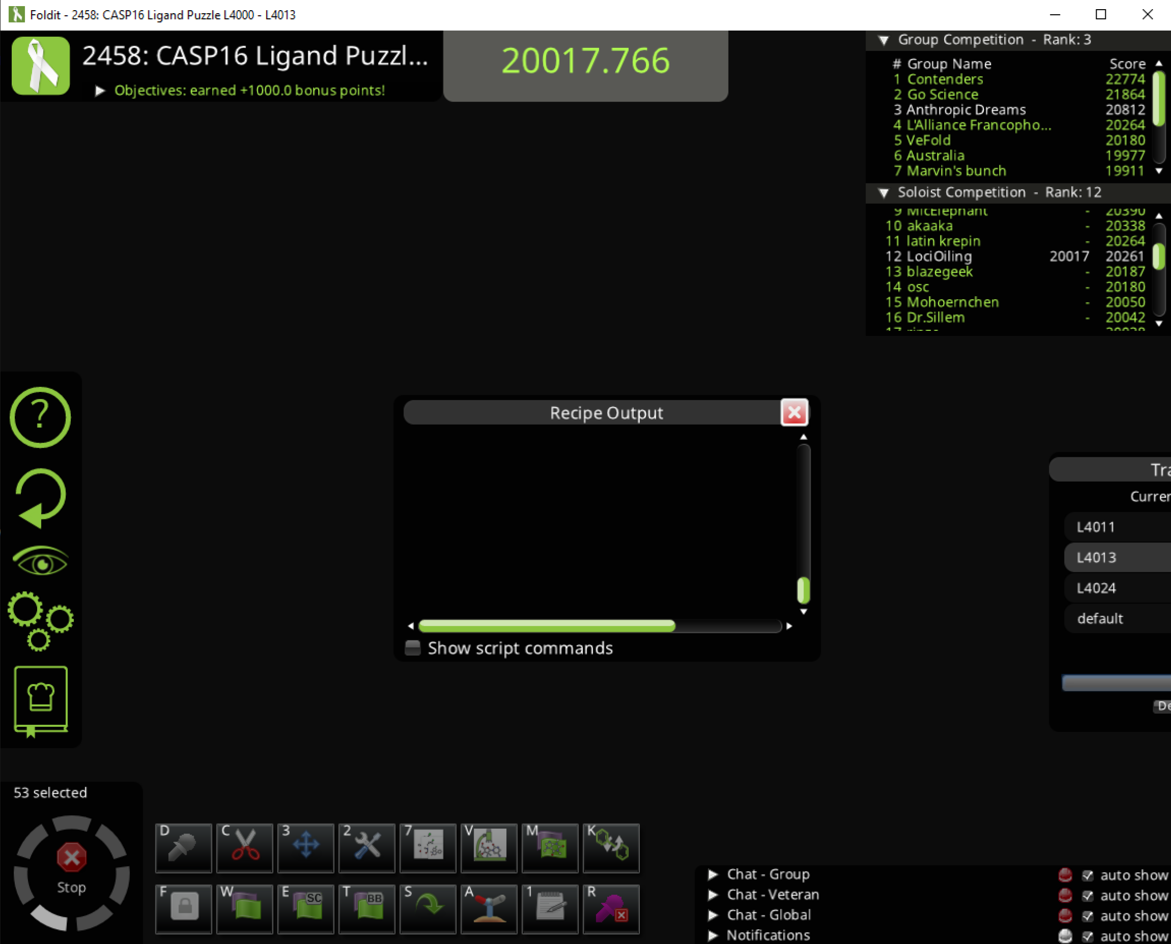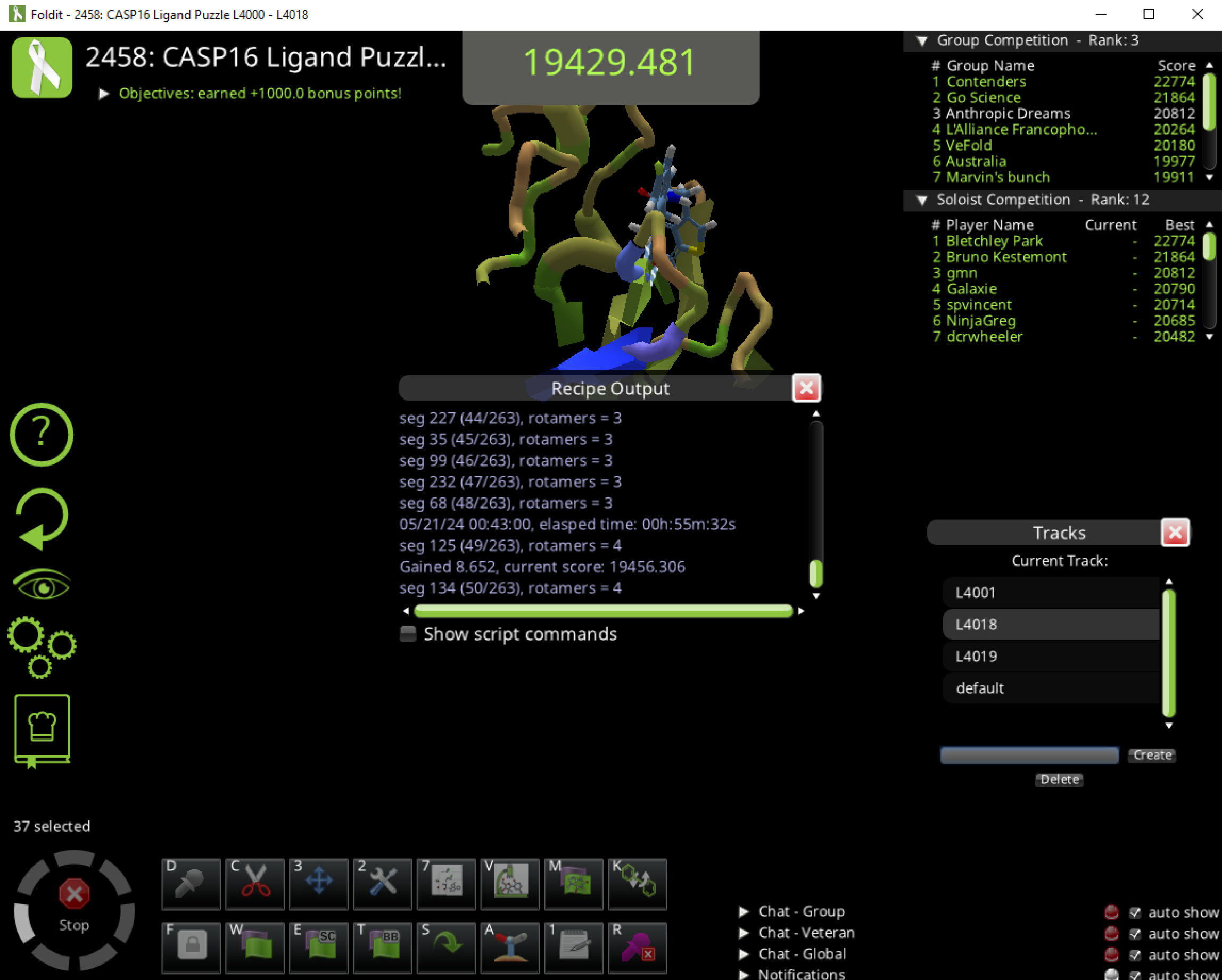 same issue with Win11 Foldit Release 35 Main, only one client is running with puzzle 2461 using recipe Ligand Docker v2.5