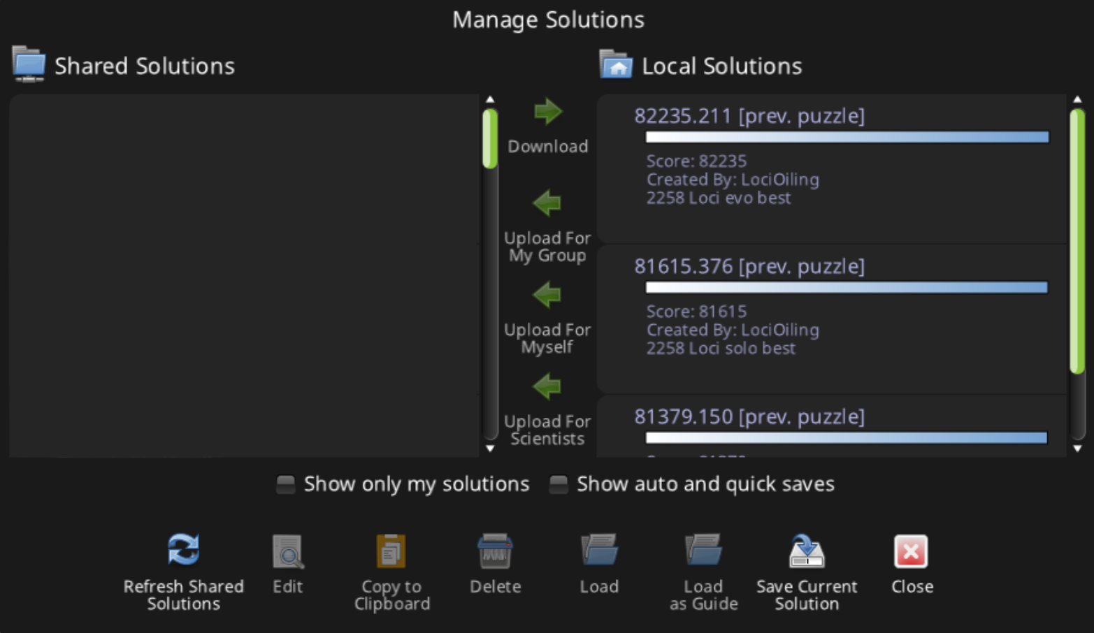 ED recon puzzle 2460 lets us load solutions saved on 2258. Players can continue work on 2258 solutions. When these 2258 solutions are shared to group, however, they can't be evolved, even with gains of hundreds of points.