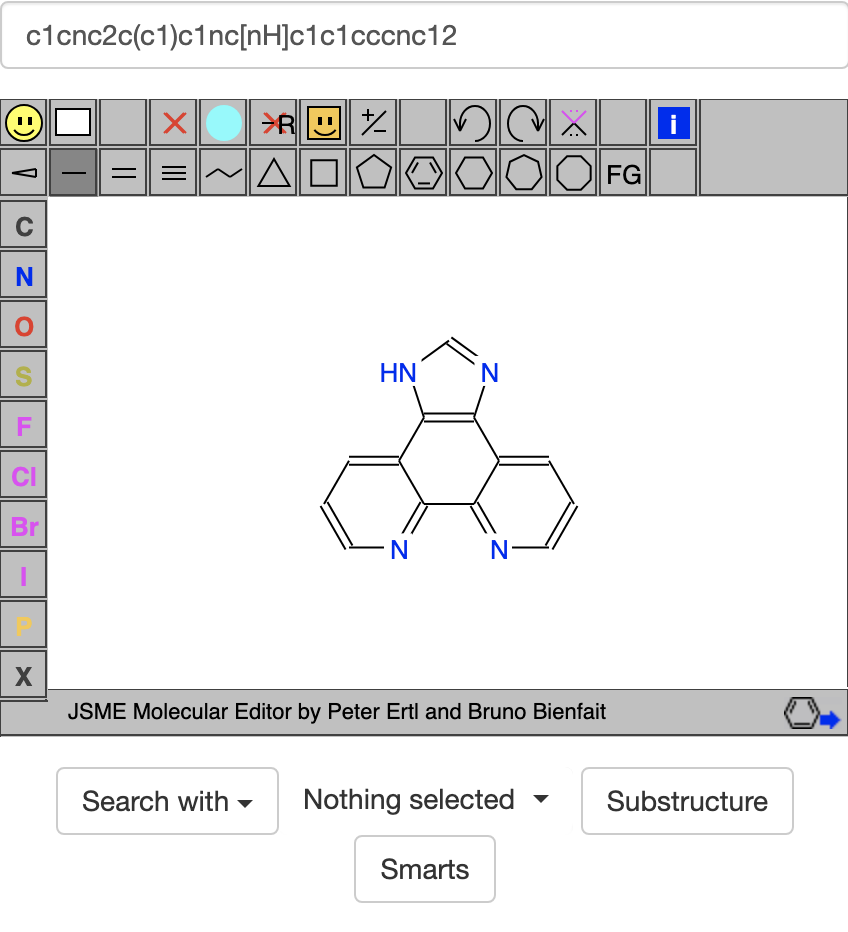 Earlier I discussed a search using https://zinc20.docking.org/rings/?ringcount=4&hba=7&hbd=3 to look for compounds with 4 attached rings, 7 acceptor atoms, and 3 donor atoms. When I did this search, I didn't realize that the rings part of the ZINC20 site was looking for patterns instead of compounds. This means it only considers things that are part of the ring system, not attached side groups like my goal compound's -OH, -NH2, and cyano groups. So for searching the rings part of the ZINC20 site, I only need to consider 4 of the acceptor atoms and 1 donor atom. Using the search https://zinc20.docking.org/rings/?ringcount=4&hba=4&hbd=1 gives many interesting hits, like c1cnc2c(c1)c1nc[nH]c1c1cccnc12 below: