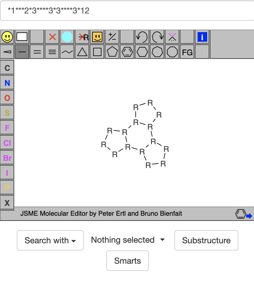 Then I clicked on the SMARTS button below the image to get https://zinc20.docking.org/substances/?sub_id-matches-sma=*1***2*3****3*3****3*12 which gave at least 100 hits, each containing a hexagon surrounded by 3 pentagons.