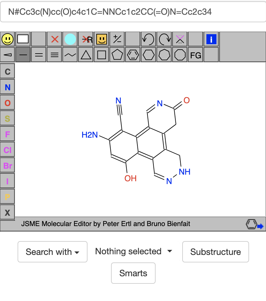 It has the SMILES code N#Cc3c(N)cc(O)c4c1C=NNCc1c2CC(=O)N=Cc2c34. If I press enter in the box containing the SMILES code, it searches for this compound in the ZINC20 library and says this compound has mol wt 305.297, logP 0.938, and 23 heavy atoms but is not in the ZINC20 library. Usually if I find something that exists in the ZINC20 library, there is a good chance that it will at least give hits (if not exact matches) in Foldit's Compound Library. Nevertheless, in Puzzles like 2404, I got the sense that compounds with 36 or more heavy atoms or molecular weight of 496 or larger were just too big to give hits in Foldit's Compound Library.
