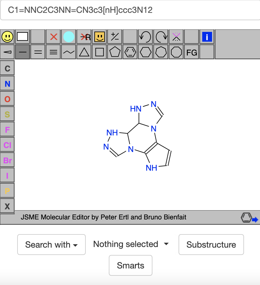 When I tried to narrow the last search to ones with only 7 hydrogen-bond acceptors using https://zinc20.docking.org/substances/?sub_id-matches-sma=*1***2*3****3*3****3*12&hba=7, it gave 13 hits, but I was surprised that none looked like C1=NNC2C3NN=CN3c3[nH]ccc3N12 shown above. I think this is because C1=NNC2C3NN=CN3c3[nH]ccc3N12 is not itself in the ZINC20 database. I think it is just a scaffold that is part of other compounds in the database.