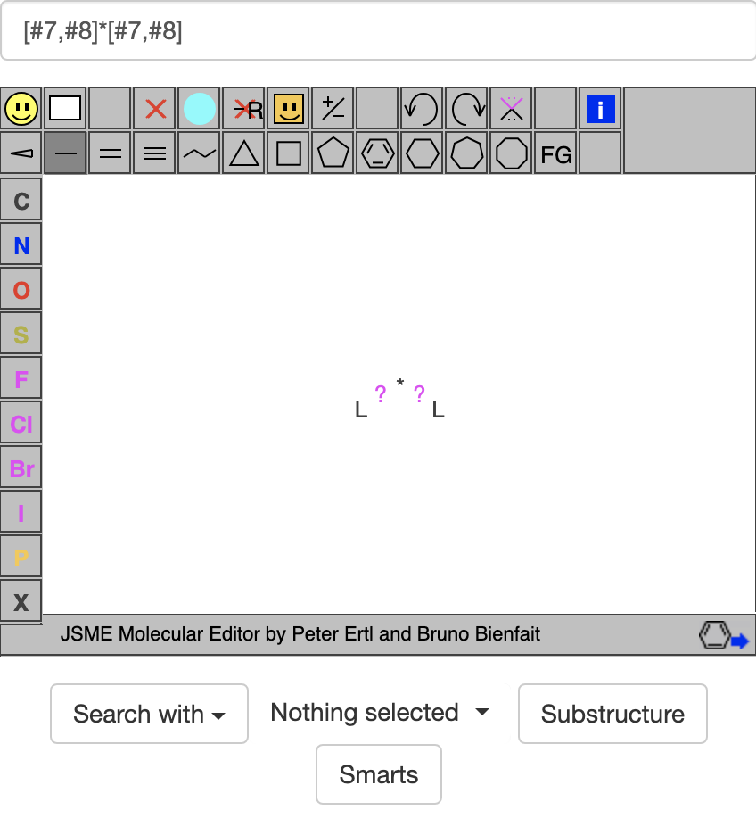 Again, the L stands for a general acceptor atom and the ? stands for a general bond, but here an * stands for the donor atom. If I then click on the SMARTS button, it gives: https://zinc20.docking.org/substances/?sub_id-matches-sma=%5B%237%2C%238%5D%5B%237%2C%238%3B%21H0%5D, which lists many compounds each with an acceptor atom adjacent to a donor atom. Note that when making the html above, the ZINC20 site has converted ; to %3B and ! to %21.
