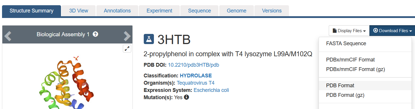 • In the example we’re using the protein-ligand complex of the lysozyme L99A/M102Q from the RCSB PDB (3HTB) which contains a 2-propylphenol ligand with residue name “JZ4”.