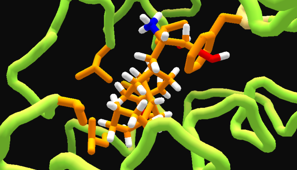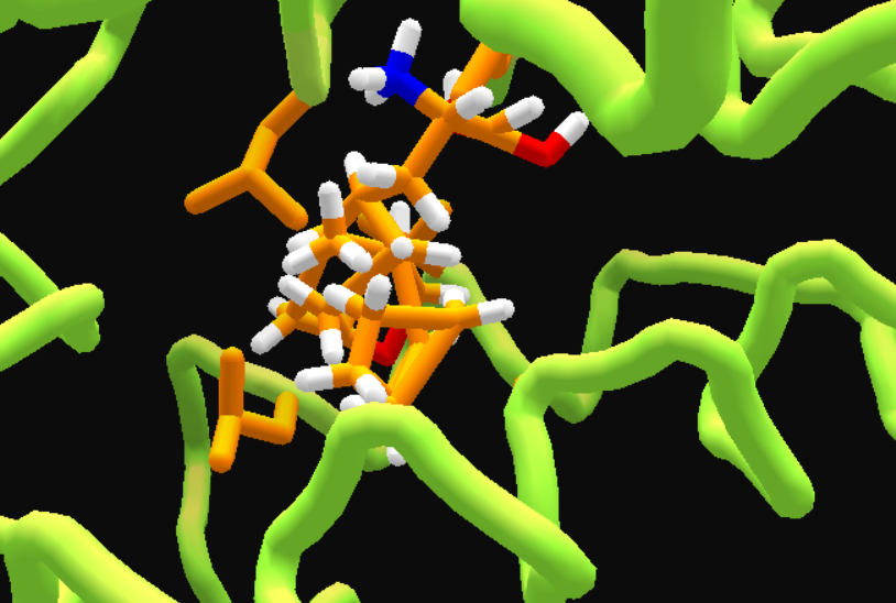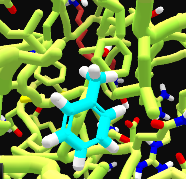 • After changing ligand color, deleting most ligand atoms till only a methane left, adding a benzene, then some wiggling.
