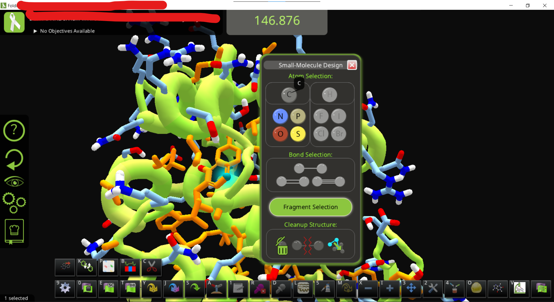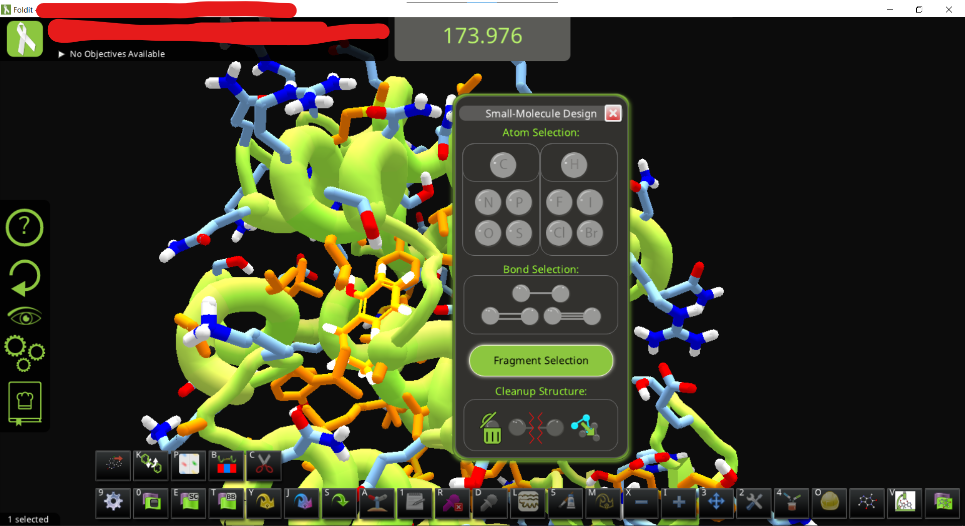 • Exporting the complex pdb also allow comparing the designed pose with docking output from external source, e.g. using some scripts or manually, removing auxiliary data from the foldit-generated pdb file, extracting the ligand, re-dock with smina using the autobox option and output in PDB format, then manually putting the top-scoring pose to the pdb file, fix the residue name/id and restoring TER record, Update: load the file that contains a ligand smiles at the end of PDB file and the manually added, docked coordinates of ligand, , then import the file(s) back into folditstandalone. The initial test of this step has some issues (showing two ligands, one of them with messed up structure, haven’t checked if its docked ligand or the params ligand) but should work after some adjustment in theory.
