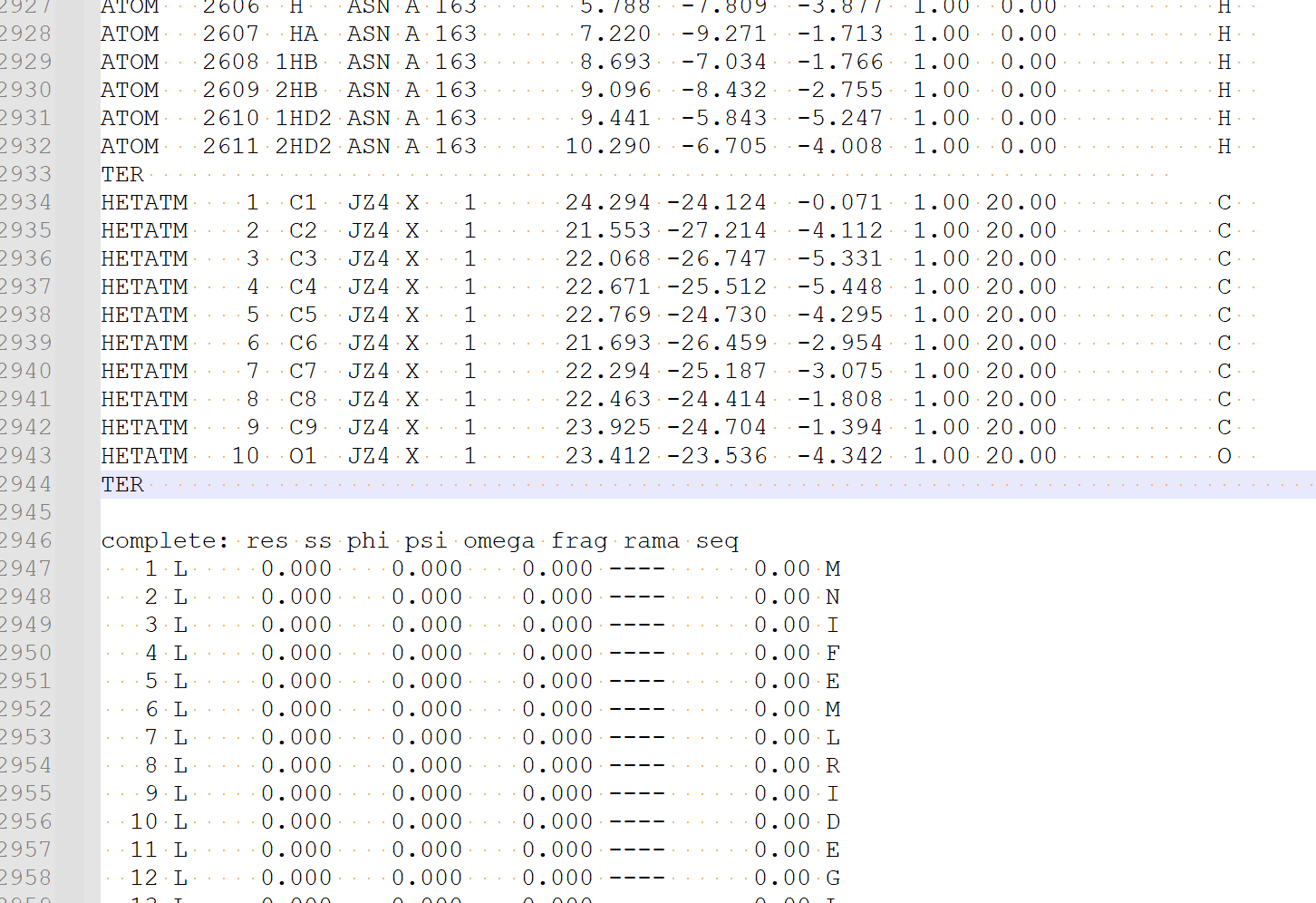 • Copy the contents of "JZ4_0001.pdb" to right after the "TER" record of the protein (around the end) of the cleaned protein file,