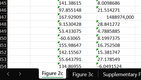 I find there is inconsistent (incorrect ?) data in the supplementary info spreadsheet, tab 'Figure 2c', multiple cells show large numbers whereas other cells show fractional values with US decimals. Can you confirm that the values used in the paper are within a proper range (<1000) ? I did not edit these values when loading your spreadsheet. If the value had been 14.88974 why did it not load similar to the other values around it ? Has this been checked by the reviewers ?