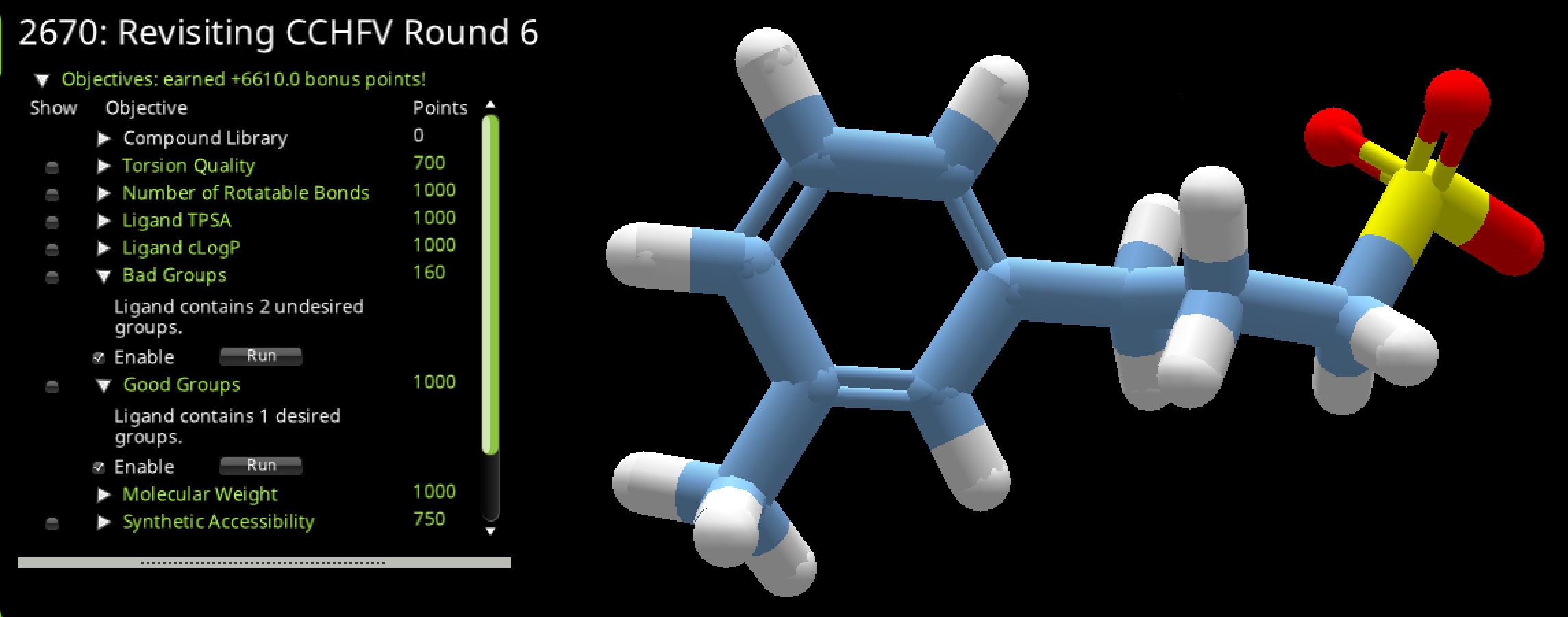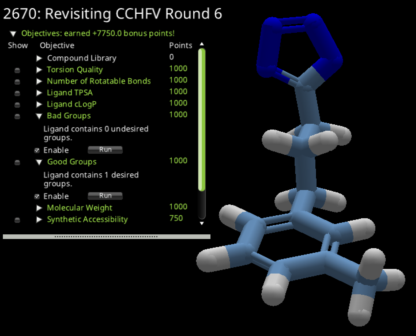 Gives a bonus if your current compound is in the library. This uses a local cached version of the Compound Library search results to determine if the compound is in the library. If you manually create a compound that happens to be in the library (or if you load a shared solution with an on-library compound), you may need to submit the compound to the compound library search and wait to get the results back before the objective can properly recognize that the compound is in the library. (If the objective is not updating, try wiggling the structure. See this forum post for more discussion.)
